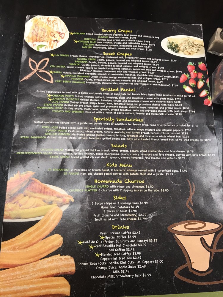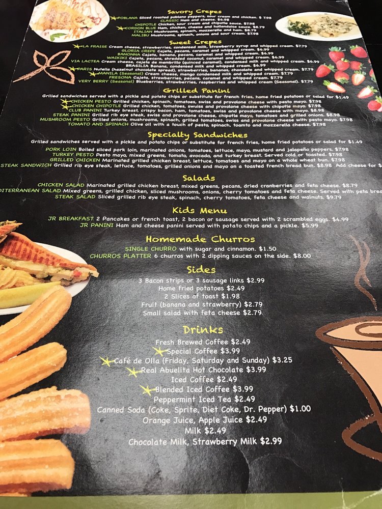 Choice of chipotle, classic, cordon bleu, country, Italian, malibu, or poblano crepe. Options for eggs, meats, and add-ons like french fries or sliced tomato.